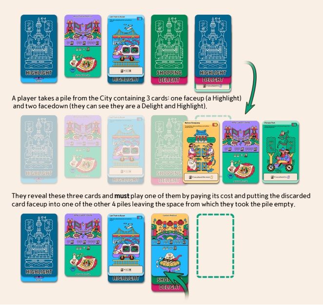 Play from your hand (Book a trip!)You know what you have. You discard one card face-up as cost (Time is limited!), play what fits your tableau, and keep control.